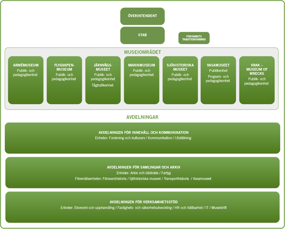 SMMTF operates and develops seven museums in four locations – the Army Museum in Stockholm, the Air Force Museum in Linköping, the Railway Museum in Gävle, the Naval Museum in Karlskrona, and the Maritime Museum, the Vasa Museum and Vrak – Museum of Wrecks in Stockholm. In addition, the civil aviation collections and the road and traffic history collections in Kjula form part of SMMTF.