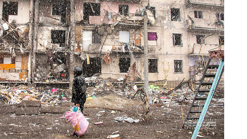 ”Meanwhile in Ukraine” är den första utställningen i en serie baserade på material från Nationalmuseet för Ukrainas historia i andra världskriget, i Kiev. Fotografierna är grupperade under sex olika teman och skildrar konflikten ur Ukrainas perspektiv, samtidigt som de sätter fokus på det allmänmänskliga lidande som varje krig för med sig.