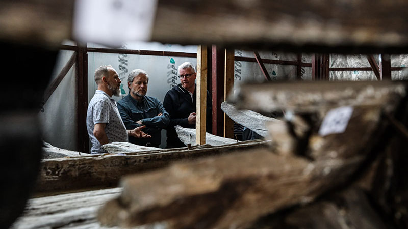 Dimitri Kobalia, chefsarkeolog vid Khortytsia National Reserve, Fred Hocker, forskningsledare Vasamuseet, och Lars Amréus, överintendent SMTM diskuterar bevarandealternativ för vraket av en hästtransport. Fotograf/Källa: Ksenia Kobalia, Khortytsia National Reserve. CC BY.